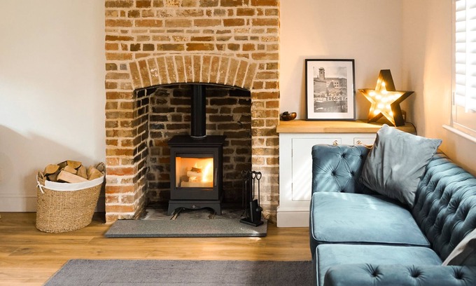 Living area: A cozy space with a log burn surrounded by a brick fire place. Ideal for chilly evenings.