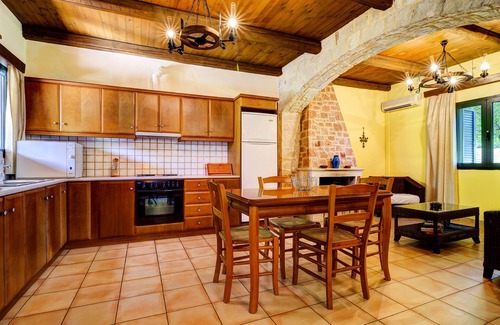 The kitchen is fully equipped with a refrigerator, microwave, coffee maker, oven, cooking utensils, toaster, dishwasher, hob, 4 ring stove and a dining table: if wished, a high chair for babies can be provided. The kitchen shelves are made of wood and have memories of the old Cretan style.