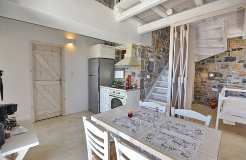 On the first level, the kitchen is fully equipped, feature dinner table with chairs, all with hand-made wooden furniture. Sit back in the living area or by the pool and take in the marvelous views of the Libyan Sea and Agia Galini village.