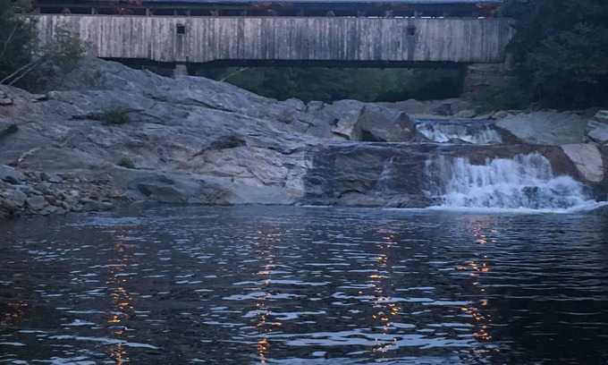 Rate includes BOTH cabins! Enjoy the privacy of a half-mile of riverfront in these two cabins right on the river! Bordered by two swimming holes and the Swiftwater Covered Bridge, the property is ideal for swimming, fishing, or panning for gold. Enjoy the Big Eddy under the bridge at one end of the property (shared with the public) or the more private Little Eddy farther downstream. Catering to family groups, the two cabins sit side-by-side just feet from the Wild Ammonoosuc. Cabin 1 features a full kitchen, 3/4 bath, living area with pull-out double futon, bedroom with queen bed and room for an air mattress, and sunroom to enjoy the rushing river. Cabin 2 features a kitchenette, 3/4 bath, living area with pull-out queen couch, bedroom with double bed and 2nd bedroom with single over double futon bunks. A large canopied deck outside (not shown) protects the cooking/eating area from sun and rain. Other amenities include: large gas grill, outdoor gas griddle, fire pits, 2 hammocks, huge yard, 3 disc-golf baskets, yard games and board games, lots of wooded acreage.