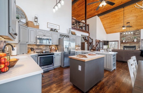 The Cottage is two stories, with the second floor being located downstairs. Upon entrance, the main floor includes a large living room and kitchen, fireplace, master bedroom, full bathroom, and laundry room with washer and dryer. Downstairs, you'll find two bedrooms that will accommodate up to eight for sleeping.