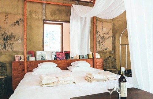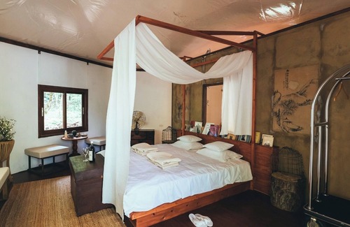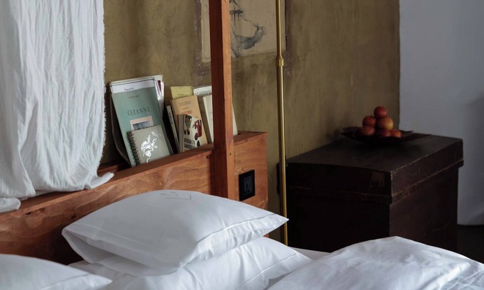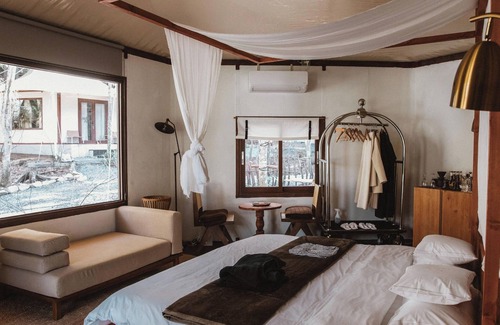 Enjoy a unique glamping experience using antique Japanese tools and modern lighting in a room with natural light