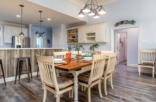 Two Palms Retreat offers an array of amenities designed for your convenience and enjoyment. With two ensuite primary bedrooms featuring king beds that open onto a gulf-front balcony, every couple can revel in the breathtaking views. The home comfortably accommodates up to 16 guests, making it ideal for large wedding parties. You will find a fully equipped kitchen with stainless steel appliances and granite countertops, perfect for preparing celebratory meals. Additional features include multiple TVs in each bedroom, WiFi, an outside shower for rinsing off, a grill for outdoor cooking, and a lovely dining area where you can enjoy meals while soaking in panoramic sunsets over the Gulf.