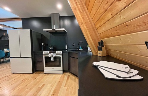 Stepping inside, you'll enter the main level, where the massive floor-to-ceiling windows flood the space with dappled light. The living room offers modern comforts with a large leather sofa, flat-screen TV, an electric fireplace, and a Bluetooth speaker for your entertainment. The kitchen is a chef's delight, featuring a large dining table for 8, modern appliances, and a coffee bar.