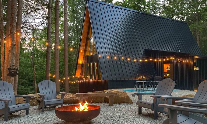 Welcome to Two Pines Hollow! This extraordinary A-Frame cabin sits on 5 acres and accommodates 8 guests. Enjoy modern amenities, a large fire pit, games, ample parking, a gas grill, a hot tub, and breathtaking forest views. Inside, find luxurious living spaces, a fully equipped kitchen, a primary suite with forest views, and a cozy basement with games. Complimentary items include coffee, tea, spices, toiletries, and a welcome basket. Your perfect getaway at Two Pines awaits!