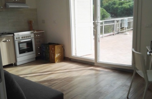 Completely renovated, air-conditioned and furnished apartment located on the attic floor of a private condominium (4th P). Two-room apartment of about 30 square meters, consisting of two separate units separated from the balcony with one bedroom double or twin beds and bathroom with shower and the other room with kitchen, table and sofa bed.