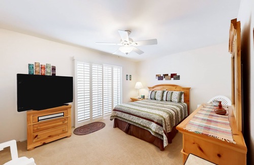 This condo features a well-equipped kitchen, a dining area with a table for mealtimes or family board games, and a living area furnished with plenty of seating for your whole group.