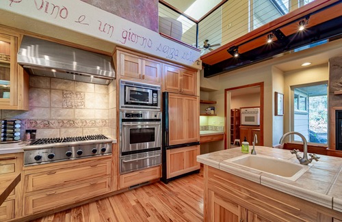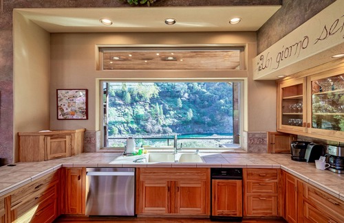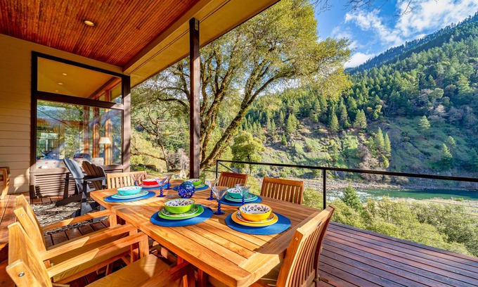 Take in spectacular views of the Trinity River from every window of this unique, open, and absolutely gorgeous home set on almost three acres! Boasting floors of madrone, hickory, and tumbled limestone, high-end amenities, and soaring ceilings, no expense has been spared to make this sunlit home a sight to behold. Prepare anything from quick snacks to full-course dinners in the open, luxurious full kitchen with a built-in desk and its own gas fireplace to keep the space nice and warm in winter. Dine together indoors at the table for six or right outside on the furnished deck overlooking the river. The main living area boasts floor-to-ceiling windows, comfortable furnishings, and a wood-burning fireplace, while upstairs, you'll find a second living space with a flatscreen TV - a great spot to gather and enjoy movies together. And outside, the fun really begins with features including a furnished patio with chaise lounges and a porch swing as well as your own private hot tub. And when the sun sets over the mountains, enjoy incredible stargazing without city light pollution.