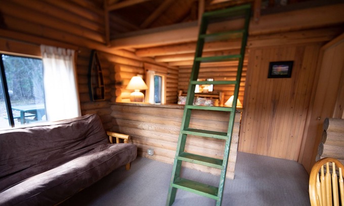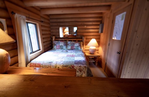 The cabin features inviting amenities that enhance your wedding experience, including a charming firepit where you can gather with loved ones under the stars. With a spacious patio ideal for outdoor ceremonies and receptions, you will appreciate the breathtaking views and tranquility of your surroundings. Inside, the cabin is adorned with natural logs, creating a warm and inviting atmosphere. A dining area allows for small gatherings, while the cozy sleeping nooks and futon provide comfortable accommodations for you and your bridal party. While there is no full kitchen, a microwave and mini-fridge are available for convenience.