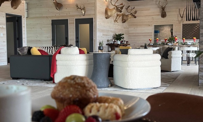 -Soaring ceilings, corrugated metal finishes, stunning wildlife mounts, and a custom chandelier that sets the tone for unforgettable events.