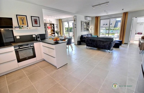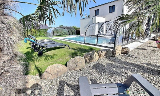 Your vacation rental includes on the ground floor: Beautiful living room with, dining room, fitted/equipped kitchen and lounge areas with large screen TV and an Xbox series X including 4 controllers... it's up to you to play! and 1 bedroom with 1 160x200 bed and private bathroom (shower and toilet), 1 separate toilet with hand basin, laundry room with washing machine and dryer. Upstairs: 3 bedrooms with 2 90x200 beds, 1 160x200 bed with TV, 1 180x200 bed with TV, bathroom with bathtub and shower screen, separate toilet. Land of 2500 m² (under development) with parking for 3 cars in the property and a green space currently landscaped with lawn and palm trees, the terrace overlooking a beautiful swimming pool heated to 28°, covered 8.30 x 4 m / 1.40 m depth open from April to October. Welcome to this spacious and ideally located holiday home: children and adults alike will appreciate the beautiful private swimming pool and the large spaces, part of which is being developed. This independent modern house, located in the heart of the wild peninsula 800 m from the beach of Pors Rand is the ideal place to spend a good holiday. 500 m from the Sillon du Talbert, a geological curiosity, a spectacular natural exception that gives you an appointment to walk along the water and preserved flora. Unmissable visits to do: Ile de Bréhat 20 km away, an island, also called the island of flowers, which is only passable on foot or by bike, a real disconnection with the mainland, Tréguier city of art and history, the Gouffre de Plougrescant. Be curious by nature! Take advantage of the many visits and events to discover all the riches of this beautiful region.