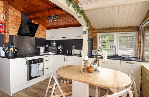 Amenities: Electric central heating with electric woodburner. Electric oven and induction hob, microwave, fridge with ice-box and dishwasher. Tassimo coffee machine (please bring own pods). 3 x Smart TVs, WiFi and telescope. USB charging point. Fuel and power inc. in rent. Bed linen and towels inc in rent. Off-road parking a short walk from lodge. Elevated decking with furniture and lawn with picnic table. Electric BBQ. 2 small or 1 medium well-behaved dogs welcome. Sorry, no smoking. Shop 2.7 miles, pub 2.8 miles