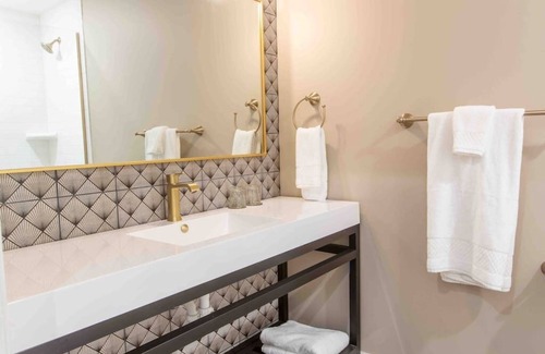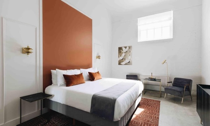 You’ll notice it the instant you walk in – the attention to detail and efforts made to meet the modern travelers' needs. Taking note from the era in which the building was constructed, each room is inspired by rich & playful colors, Art Deco motifs, art and opulent fixtures. Starting with the kitchenette; complete with quartz countertops and brass finishes to the memory foam mattress and spacious bathroom gives each studio an inviting stay. Relax in the velvet armchairs while you sip your morning coffee or evening libation. Each Deluxe Studio offers a coffee station, microwave, mini-fridge, organic toiletries and bath towels, memory foam mattress, closet space, SmartTV, high speed WIFI, eco friendly sateen linens and full length mirror.