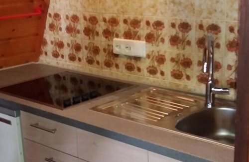 Charming A-Frame Holiday Home with FireplaceThis detached A-frame house comfortably accommodates up to 4 guests across approximately 50 m² of living space spread over two levels.The ground floor features a cozy living area with an open fireplace, a sofa corner, a dining space, a compact kitchenette, and a bathroom equipped with a shower, sink, and toilet. A small hallway connects the areas, and the living room offers direct access to a private terrace.Upstairs, there are two bedrooms, each furnished with two single beds and a wardrobe. Access to the upper floor is via a space-saving staircase with alternating tread steps, which may not be suitable for small children or guests with limited mobility.The kitchenette comes fully equipped with a sink, refrigerator, four-burner stovetop, coffee maker, kettle, toaster, and a full set of pots, pans, dishes, cutlery, and glasses – ideal for a self-catering stay.Each single bed is fitted with a spring mattress (200 x 90 cm), a pillow (80 x 80 cm), and a duvet (135 x 200 cm) to ensure a comfortable night's rest.Layout-Übersicht:2 bedrooms with 2 single beds eachLiving area with open fireplaceKitchenetteBathroom with a shower and a toilet