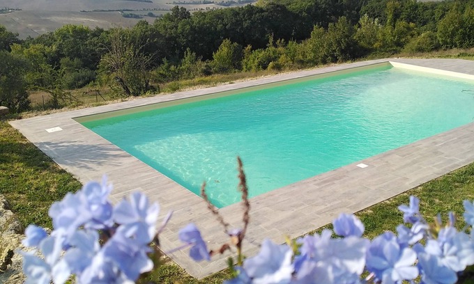 The recently renovated farmhouse, surrounded by a large private garden, is located in a panoramic position. The large porch allows you to enjoy the view in an open but sheltered space. The swimming pool, which is accessed by a short staircase, is equipped with an umbrella and deck chairs, allowing you to admire the landscape in total relaxation.