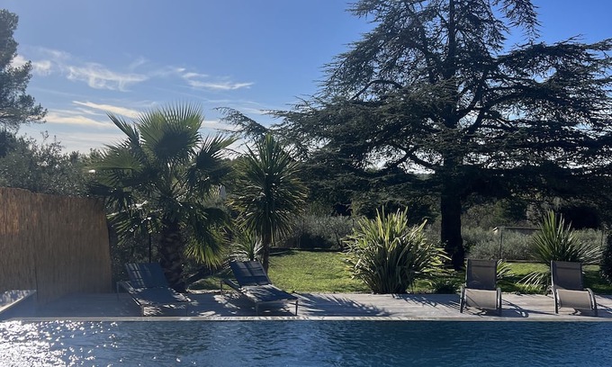 Beautiful large property in olive trees and pines, large warmed swimming pool with fountain, several terrasses, 5 acres field, close to famous Alpilles, lake view, 2 electric vehicles superchargers, haven of calm and peace