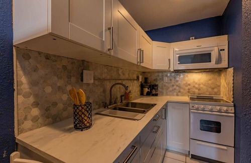 Your small Kitchen is very well equipped with a refrigerator and freezer, microwave, blender, coffee pot, plus all pots and pans, utensils etc. It has everything including the glass top electric stove with an oven. There is a laundry room including a Full-sized washer dryer with no coins required.
