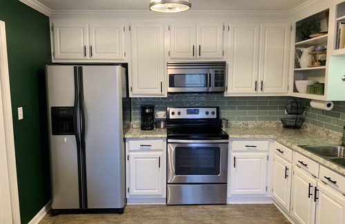 Welcome to Cedar Drive! This adorable split-level cottage-style home is located in the heart of downtown Watkinsville, Georgia, and is the perfect rental home for your Georgia game-day weekend, a weekend trip or visiting for the holidays. You can avoid the traffic on gameday weekends and take an Uber or Lyft directly to downtown Athens or Sanford Stadium! With three unique bedrooms and three bathrooms (two full), this house can accommodate families or groups of friends. There are two artistically designed bedrooms upstairs, one featuring a queen-sized bed, the other featuring a queen-sized bed with a lofted twin bed, both with adjacent bathrooms. The third bedroom is downstairs near the common areas and features a double/twin bunk bed, and a half bath.