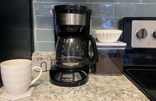 This rental has one outdoor grill (bring your own gas), a fire pit beautifully positioned under lovely trees draped in outdoor lights and a tranquil creek at the back at the property for those who love to cook and entertain outside. The kitchen is fully equipped with all the amenities guests need to prepare delicious meals-including toaster, instant pot, air-fryer, and more. The dining room has a stunning view of back of the property and is perfect for enjoying meals with friends and family.
