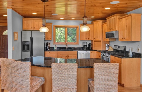 The home features vaulted knotty pine ceilings in the great room with a wall of windows overlooking the pond, an open concept kitchen with large granite island and stainless steel appliances. The spacious master bedroom/bath with king bed and an additional bedroom with adjacent full bath with queen bed, completes the main level. Overlooking the great room is a loft with two futons, and full-sized/twin bunk bed. The walk-out lower level includes a full bath and 2 more bedrooms with queen beds and twin bunk beds in both. The rec room has another pull-out queen sofa, a flat screen high definition tv above the stone fireplace and opens to a patio leading to the pond. The home features a Sonos Wifi 6 zone sound system for your listening pleasure, allowing you seamless access to your personal music accounts through your phone or ipad along with SiriusXM channels, Spotify, Pandora, and any of your other listening favorites.