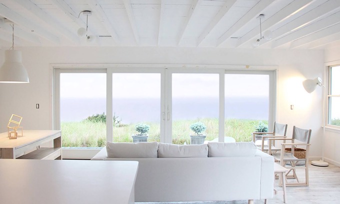 Newly renovated, The Beach Cottage has been designed and decorated in a modern organic style, with a palette of whites and neutrals to create a serene and peaceful escape. Relax in the airy, light and open living room, which features a wall of glass for indoor/outdoor living with expansive, uninterrupted water views.