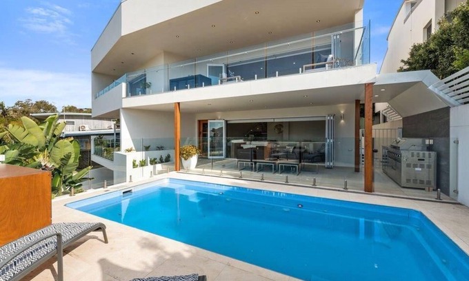 Everything we provide is top quality and the home is impressive in size, style and amentities. If you are looking for a beach house to share with friends or family where you can all stay together in a stunning beach location, without compromising comfort and style, this is it. 5 bedrooms, 3.5 bathrooms, 3 lounge and numerous entertaining areas. Swimming pool. Air conditioned. Gourmet kitchen. Fenced rear yard. Outdoor kitchen and undercover entertaining. Ocean views from all levels of the home. Ultimate games room with Pool table, Air Hockey, Foosball, Big screen projector. Surfboards, bikes, games. Gourmet kitchen- everything for entertaining. 1 minute walk to quality restaurants and shops. Boasting 3 king bedrooms and 1 queen bedroom, a large kids bunk room for 8 kids/adults, (all with separation for privacy) the home can accommodate up to 18 people. Outdoor bar and lounge on top level and outdoor undercover dining area beside swimming pool on level 2. All verandas including master bedroom, living areas and kitchen have bi-fold doors, allowing the entire ocean facing side of the home to be open to the view and breeze with sweeping ocean, beach, island and headland views from all levels of the home. Modern spacious, clean design with three separate lounge areas with big screens and surround sound. All bedrooms are also fitted with flat screen TV's and Chrome for watching Netflix, YouTube or your favourite TV channel. Foxtel boxes and 75 inch HD TV in main lounge area. Ultimate games room with pool snooker table, air hockey table, big screen and projector for sports and movies and Fooseball table. You will never see the kids. Gourmet kitchen is spacious and modern with butlers walk in pantry fitted with every possible appliance and piece of catering equipment. Miele appliances throughout including oven, steamer, plate warmer, microwave, dishwasher and double fridges. Zip hydroboil with instant cold filtered water on tap and boiling water. Full size additional fridge and freezer downstairs and drinks fridges outside at the outdoor kitchen. Look at the beach from the veranda and you can stroll to the sand in 1 minute. An ideal family beach for surfing, swimming, dog walking and play, fronted by a park with BBQ tables, playground and amenities. walk deserted beaches and headlands for many kilometers in each direction. Surfing, swimming, fishing, beach games and cricket all there. We provide surfboards, Boogie boards, fishing rods, push bikes, scooters, Eskies, pool toys and many games and toys for the kids. There is a nice flat locked rear yard that is safe for the kids to play and a herb garden and fruit trees- limes and lemons for the drinks! Emerald beach has some truly fantastic restaurants within 1 minute walk- just at the end of the street. Mexican, Wood Fired Pizzas and Pasta, Ribs, Surf Street Cafe for a magnificent breakfast and coffee, lunch or dinner. Wired coffee shop for great coffee and pastries. There's also a general store with burgers, fish and chips, healthy vego fare and the usual ice creams, sweets, groceries, bread etc. And of course- Emerald Beach Bottle Shop and Wine Store for top up of supplies without the need to drive.