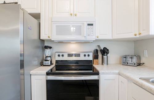 Your stay in this beautiful condo comes equipped with all the amenities you could need for a relaxing getaway. Enjoy the expansive heated lagoon pool that features waterfalls and a hot tub, perfect for unwinding after wedding festivities. The fully furnished kitchen allows you to prepare delicious meals, while the cozy living room offers high-speed internet, a TV, and comfortable seating for everyone. Both bedrooms are designed for maximum comfort, with plush bedding ensuring restful nights before your big day.