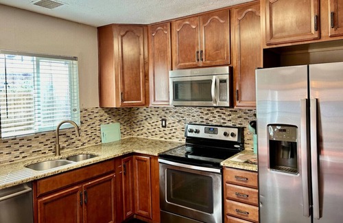 This beautifully updated, fully furnished home is not only spacious, but it is also stocked with all the things you will need for a month or multi-month stay! Perfect for business travelers, a family, or a group of roommates, with two full bathrooms and five comfortable beds (one king and four queen beds). Three of the bedrooms have queen-size beds (one bedroom has two queen beds as pictured), as well as large closets. The master bedroom has a king-size bed and an en-suite bathroom.