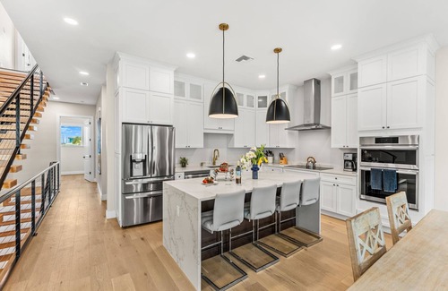 Fully equipped kitchens with quartz countertops and premium stainless steel appliances
