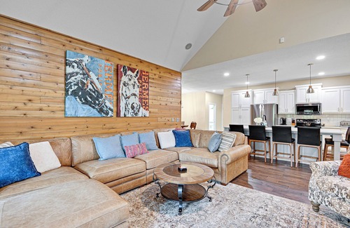 This 7 bed/5.5 bath home sleeps up to 21 guests, on two levels. There is a huge, adult loft game area AND a kids gaming/play area with a large bunk room on the lowest level with a walk-out to the pool. The lower level also has a 3rd Master with ensuite and walkout to the pool. The main level has 4 bedrooms with King beds and 1 with two twins.