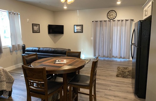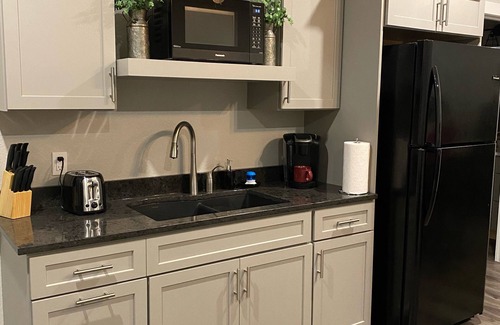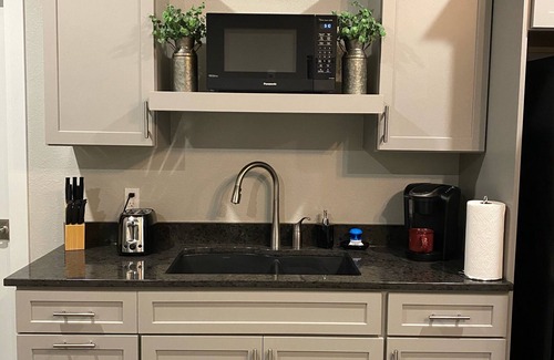 Everything is newly constructed with quality and care to be the perfect landing spot. This suite is designed to offer everything you’d expect for when you are away from home. Enjoy the comfort of clean new bedding and plush towels, high-speed WiFi, and a well-equipped kitchenette with Keurig (and coffee/tea) perfect for a quick snack or a full meal. New (no charge) washer and dryer available as well to make your stay complete.