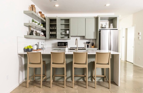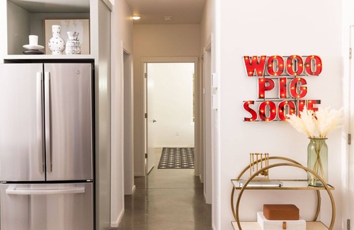 You won't just love the location of this property. The interior was meticulously designed to provide a cozy and stylish living experience, and exudes tranquility, with its polished concrete floors, large windows and neutral color palette. It is fully stocked with all the modern amenities you need for a comfortable stay, featuring chic furnishings, a fully equipped kitchen, plush and cozy bedding, high speed wi-fi, smart TV, in-unit laundry facilities and free on-site parking for 1 car. The fully equipped kitchen is an entertainer’s dream with its sleek stainless steel appliances, ample storage, large basin sink, and a gorgeous quartz waterfall countertop. The walk-in pantry provides plenty of room for all your groceries, allowing you to keep the kitchen clutter-free. The spacious laundry room makes for effortless laundry days. You'll love all of the at-home comforts so close to the U of A. Whether you're heading to Fayetteville for a Razorback game weekend, college tour, or just to enjoy a long weekend in this idyllic town, this lovely apartment is the perfect place for you.