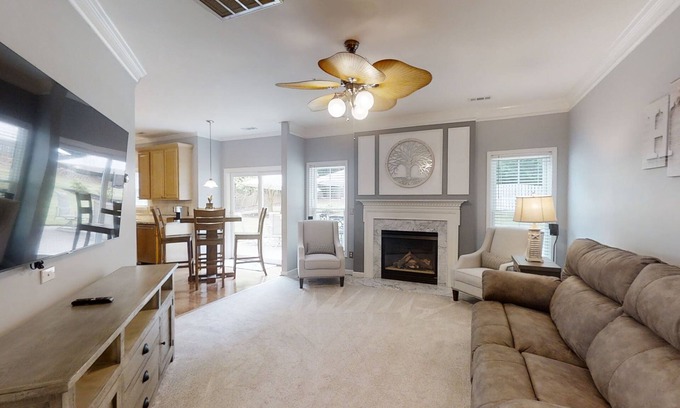 Come and enjoy our home nestled within a friendly neighborhood. Your home away from home sleeps 8 very comfortably. With small children, you can sleep more. No more than 10 without prior approval. 65 Inch TV will make game day awesome. Take yourself to the very large back patio equipped with comfortable tables, BBQ grill or relax right next to the firepit while the sun goes as you watch the competitive game of corn hole going on. If you enjoy a game of pick up basketball, you may just find yourself in the front of the house making that happen. Don't like the outdoors too much...no worries, the game room upstairs will keep you or the kids occupied with foosball, the street fighter arcade, jenga, board cames or yes, that PS4 that is always fun.