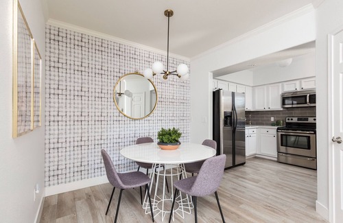The living room boasts brand new furniture with Flat Screen LED TV with expanded cable channels, Netflix access, and DVD player. Beautiful Dining area with custom wallpaper and flexible seating. A great place for dinners at home or to play one of the many games available in the unit.
