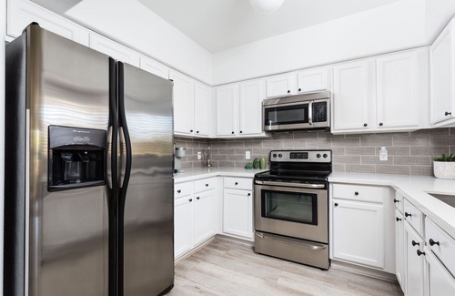 This luxury condo is equipped with a fully stocked kitchen with everything you'll need. Coffee maker, Keurig, blender, ice maker in refrigerator, etc. Full-size Washer and Dryer is located in the unit. Large refrigerator for all of your food/drink stocking and cooking needs.