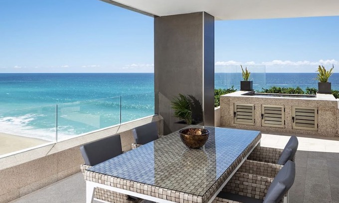 As you walk in, you will notice a stunning gourmet kitchen with a breakfast bar complete with upscale appliances, a dining area that seats 8, and a living room with an entertainment center, a sleek 55-inch flat screen TV, two plush sofas, and two lounge chairs with the geometry of coral. An open floor plan flows out to an expansive wraparound terrace with an ocean-facing jacuzzi and plenty of room for relaxation.