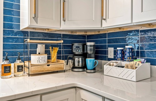 Just off the living room, the well-stocked kitchen has everything you need to prepare a delicious meal. Start your morning with a freshly brewed cup from the fully stocked coffee bar. The adjacent dining area features a table with seating for four, making it an ideal space to share meals and laughter with loved ones.