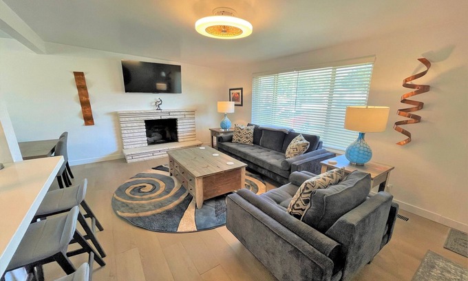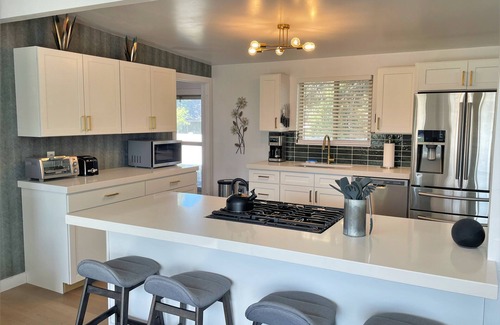 The home has a very modern open floorplan, which means that you and your group can be in adjoining rooms, yet still feel that you're spending time together since the rooms flow together well. There are two large TV rooms with several streaming channels like HBO Max, Netflix, Prime Video, Paramount+, Disney+, etc. already installed and ready to be logged into. The dining area has a large table as well as plenty of bar seating, and opens up to the back patio where there are additional dining seats. The kitchen is brand new and has everything you'll need to cook large meals for your family. The bedrooms all have new beds with deluxe mattresses and bedding for a perfect night's sleep. The neighborhood is a very quiet residential area but it's close to several great restaurants and grocery stores.