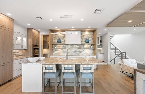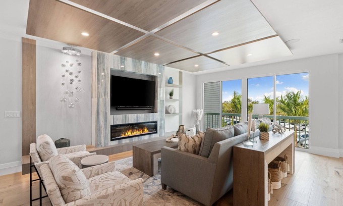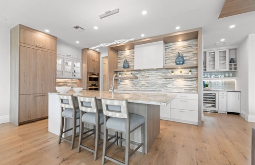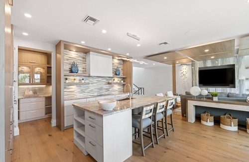 Every detail has been thoughtfully curated for comfort and style. The open-concept layout features soaring ceilings, gleaming quartz countertops, and top-of-the-line Bertazzoni & Thermador appliances. A walk-in butler's pantry, designer lighting, and refined finishes transform the living space into a true coastal showpiece.