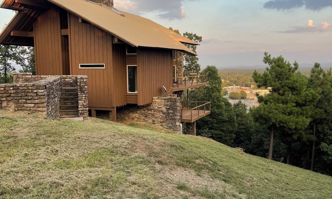 Beautifully remodeled 3 story home originally designed by architect E. Faye Jones who studied and worked with Frank Loyd Wright. This home is truly unique in design and is elevated overlooking the city of Mena with breathtaking views of the mountains.