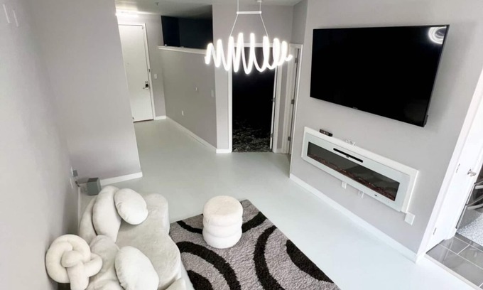 Ultra modern renovated & upgraded 1 bedroom loft centrally located in Atlanta minutes away from it all! High end new appliances, beautiful quartz countertops and island with stools, huge TV in the living room with a remote color changing fireplace below it, luxurious silk shag carpeting in the bedroom with a queen bed & TV, walk in closet, jetted bathtub & shower, heated towel rack, LED smart thermostat & ceiling lighting, balcony with a skyline view in distance, secured gated complex with security, 1 parking spot right in the front, in unit washer / dryer, high speed WiFi,