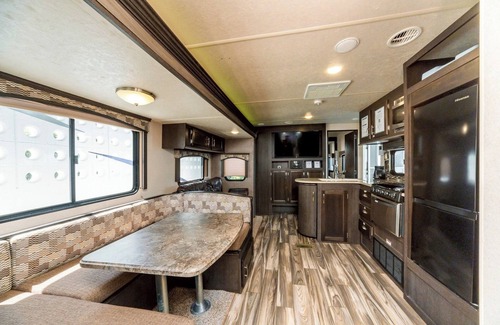 The accommodation building is a highquality camper trailer The interior is unified with dark brown woodgrain decor and is functional and comfor