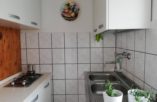 La cucina separata è essenziale ma provvista di tutto l’occorrente: composta doppio fornello, lavabo centrale, un piccolo piano di lavoro e dello spazio di stoccaggio. Tutti le stoviglie si trovano all’interno di mobili e ante.