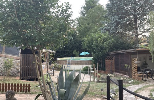 The apartment has a double bedroom, a living room with fireplace, equipped kitchen, private bathroom and direct access to the shared garden with swimming pool, ideal for reading, meditating or enjoying a glass of wine at sunset.