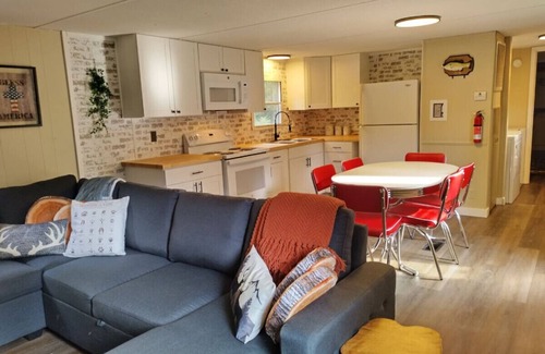 The second bedroom is the ultimate sleepover spot, with four twin beds (two twin over twin trundle beds) and a direct-access door to the hallway bathroom, creating a convenient Jack-and-Jill-style setup. The room also features a TV and a cozy desk area, complete with old-school fun: Pac-Man and Asteroids games are ready to play!