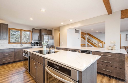 Spacious Gathering Areas: The impressively designed main level features soaring cathedral ceilings and a cozy great room with a stunning stone hearth, accommodating both intimate gatherings and larger groups comfortably.