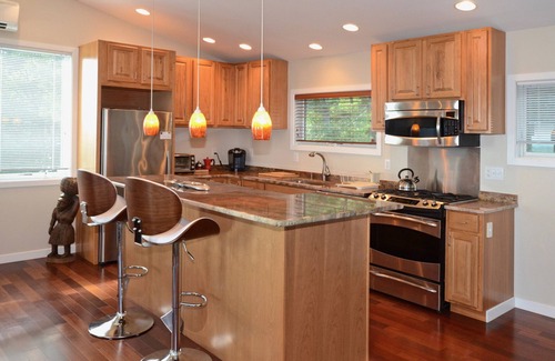 SKYLOFT is the epitome of open concept. Vaulted ceiling throughout the space. 1 bedroom with queen-size bed, a beautiful, full kitchen with quartz countertops, full bath w. glass-walled stall shower. Wi-Fi, Smart TV, Fooseball table.--you won't want to leave!