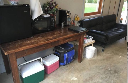 While the yurt where you will be sleeping is a short walk from the main building, you will have 24 hour access to a half bath from the garage, and you will also have a full bath with shower available during breakfast and evening hours. (7-8:30 AM, 5-6:30 PM). You will also have 24 hour access to our coffee and tea station conveniently located near the half bathroom in the adjacent garage space. (this space also has a small fridge and microwave)
