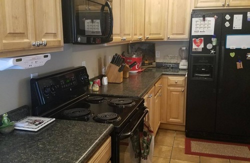 We don't want you to have to pack like you are camping! Just bring your food. There are pots, pans, baking sheets, baking dishes, measuring and serving ware, silverware, 2 crock pots, blender, toaster, and dishes. Refrigerator is side-by-side with ice maker. Electric range, stove and overhead microwave are provided. Garbage disposal and three-section sink eases food preparation.