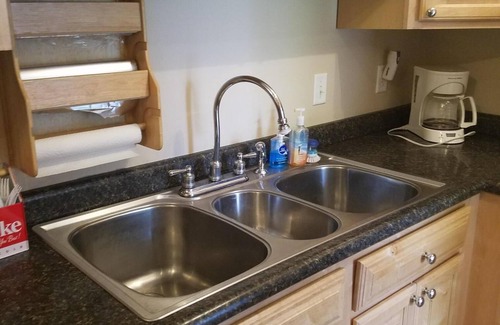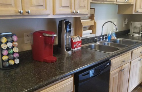 Many additional amenities such as Keurig as well as 10 cup coffee maker with coffee and filters are provided. Various spices, plastic containers, foil, paper towels, plastic wrap, dish detergent, and dishwasher detergent are available.